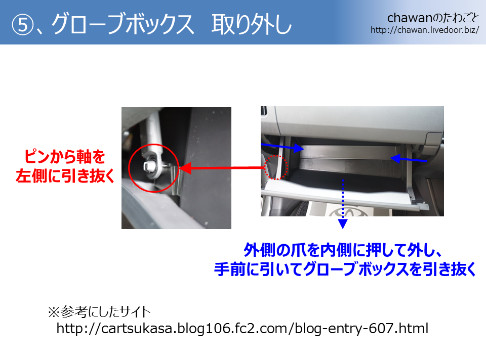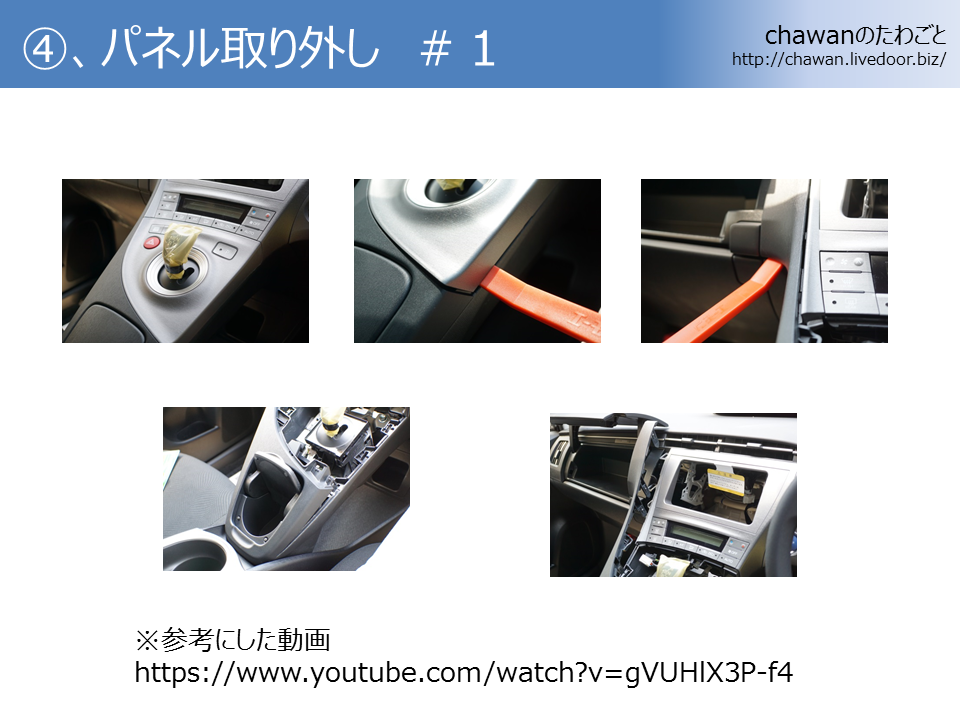 ほとんどネットで調べた情報で、特にYoutubeの動画は内装パネルを外す方法がよくわかりました!