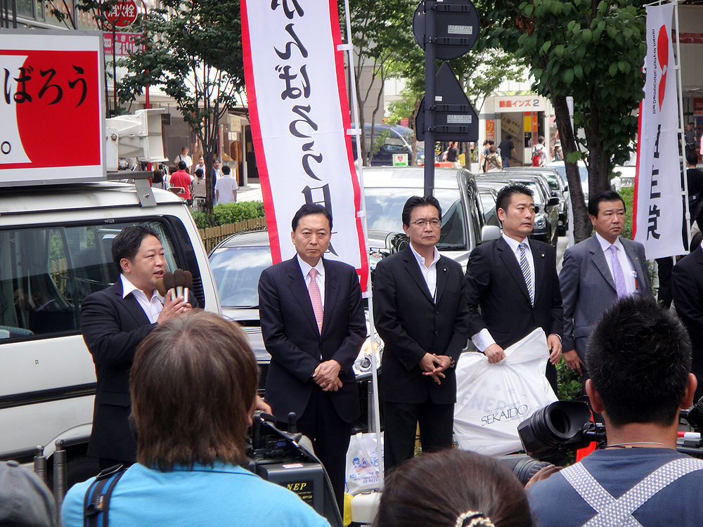 日章旗切り刻み民主マーク!鳩山氏「神聖なマーク、きちんとつくるべき」